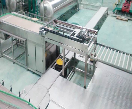 本機(jī)主要應(yīng)用于對(duì)各種罐裝飲料或罐頭等在二次殺菌后進(jìn)行自動(dòng)卸籠作業(yè)。通過推罐卸出裝置將堆棧于殺菌籠里的實(shí)罐,由上而下一層一層的推至輸送平臺(tái)上,整個(gè)卸籠過程隔層板自動(dòng)取出、自動(dòng)收集,罐層自動(dòng)上升、自動(dòng)卸罐、空籠自動(dòng)停止卸罐自動(dòng)下降,取代人工卸籠方式,節(jié)省人力,大大提高生產(chǎn)效率。